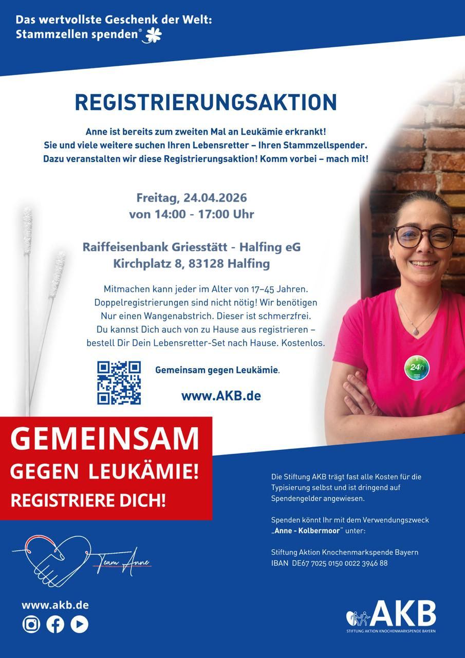 Gemeinsam mit Team Anne führen wir eine große Registrierungsaktion gegen Leukämie durch. Kommt alle am 24. April in unsere Hauptstelle in Halfing. Weitere Informationen finden Sie hier auf dem Plakat.
